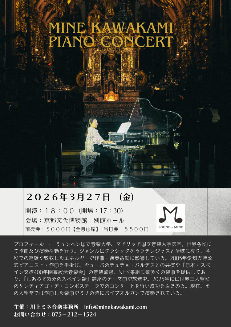 ロームシアター京都会場・三井住友しらかわホール会場での 『川上ミネピアノソロコンサート』中止に伴う払い戻しにつきまして
